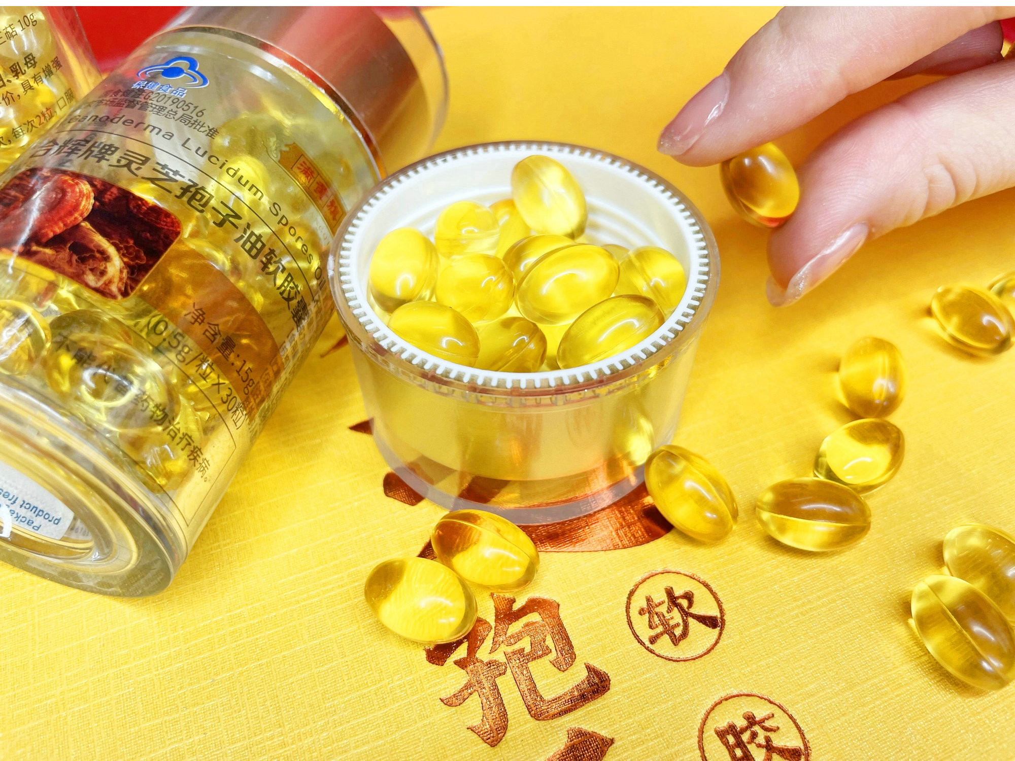 高品质的灵芝孢子油常温下呈金黄色,光泽鲜亮,闻起来有灵芝香气,入口甘香。